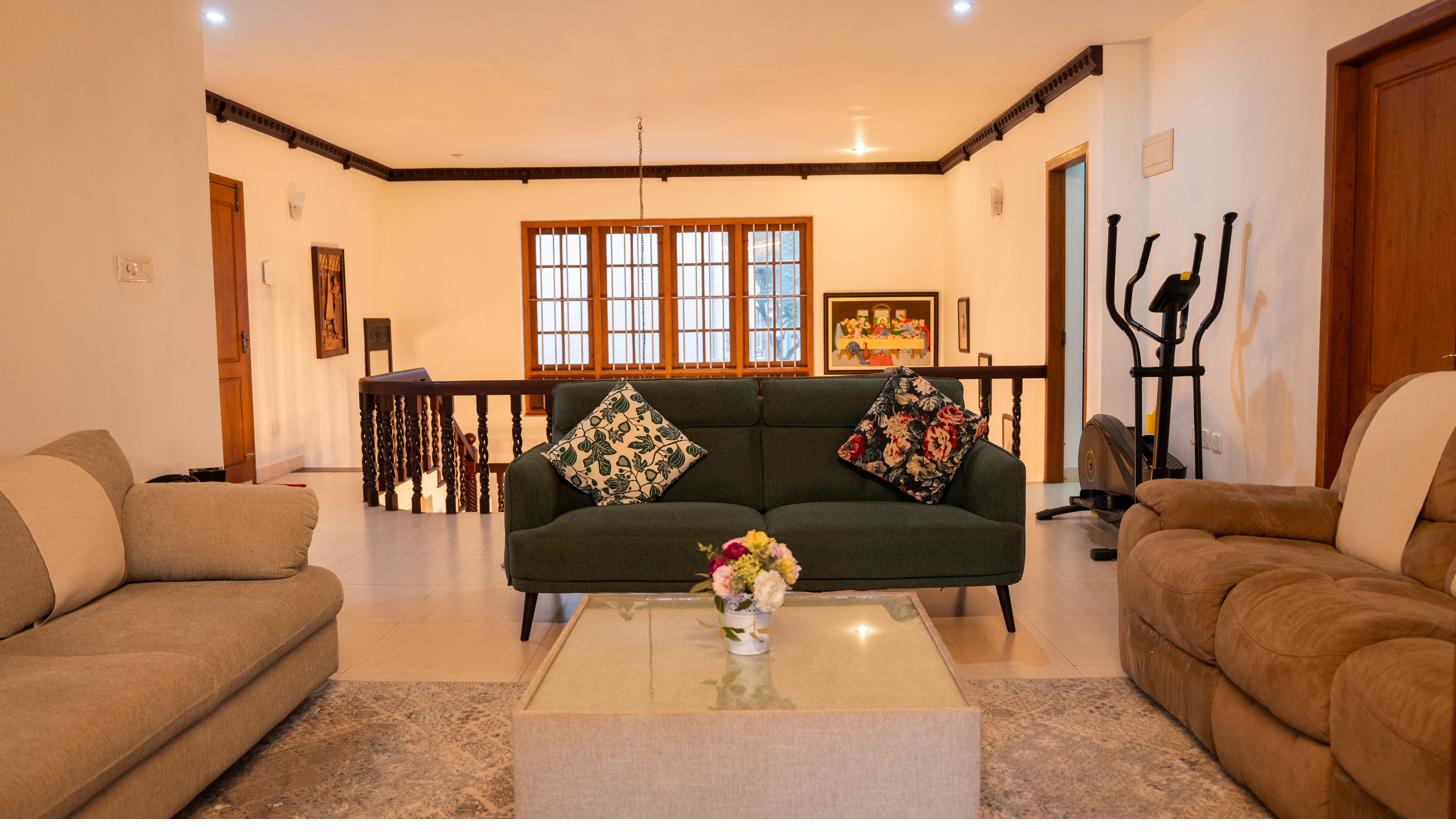 Five large bedrooms, each with AC and an attached bathroom. One small extra room with a single bed — good for 2 children or a single guest. Three sitting halls, two dining areas, and a fully-equipped kitchen. Room for everyone to spread out or come together.