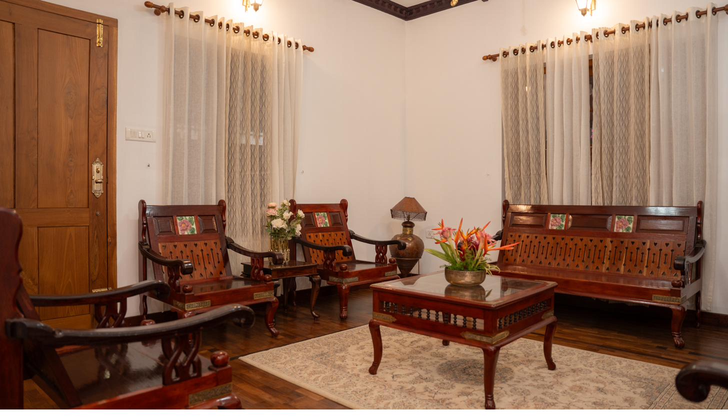 A Kerala-style home in a quiet Mysore neighbourhood — red-tiled roofs, carved doors, a verandah under pink bougainvillea.